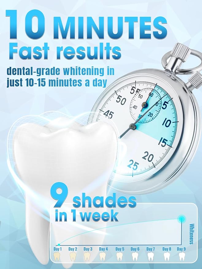Brighten your smile with this LED Teeth Whitening Kit, which combines a medical-grade mouth tray, LED/UV-activated accelerator light, and 35% carbamide peroxide gel (approx.). Treatment sessions last just 10 minutes per day and deliver up to 8 shades whiter teeth in about one week. The included mouth tray fits all teeth, features ventilation, and provides hands-free comfort. Breath-friendly peppermint gel reduces sensitivity and is enamel-safe. Over 12,000 rave reviews highlight fast, visible results without pain.