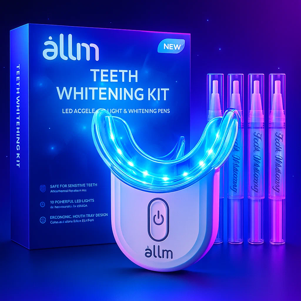 At-home LED-powered teeth whitening kit featuring a mouth tray with built-in light, peroxide gel syringes, and fast results—designed for safe, convenient whitening.